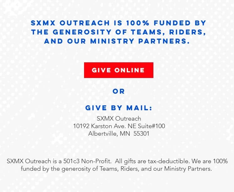 The SXMX Outreach Ministry holds chapel after each and every riders meeting of the year during the professional Supercross and Motocross schedule. This means traveling all over the United States on 30+ weekends a year with significant expenses for flights and hotels.
